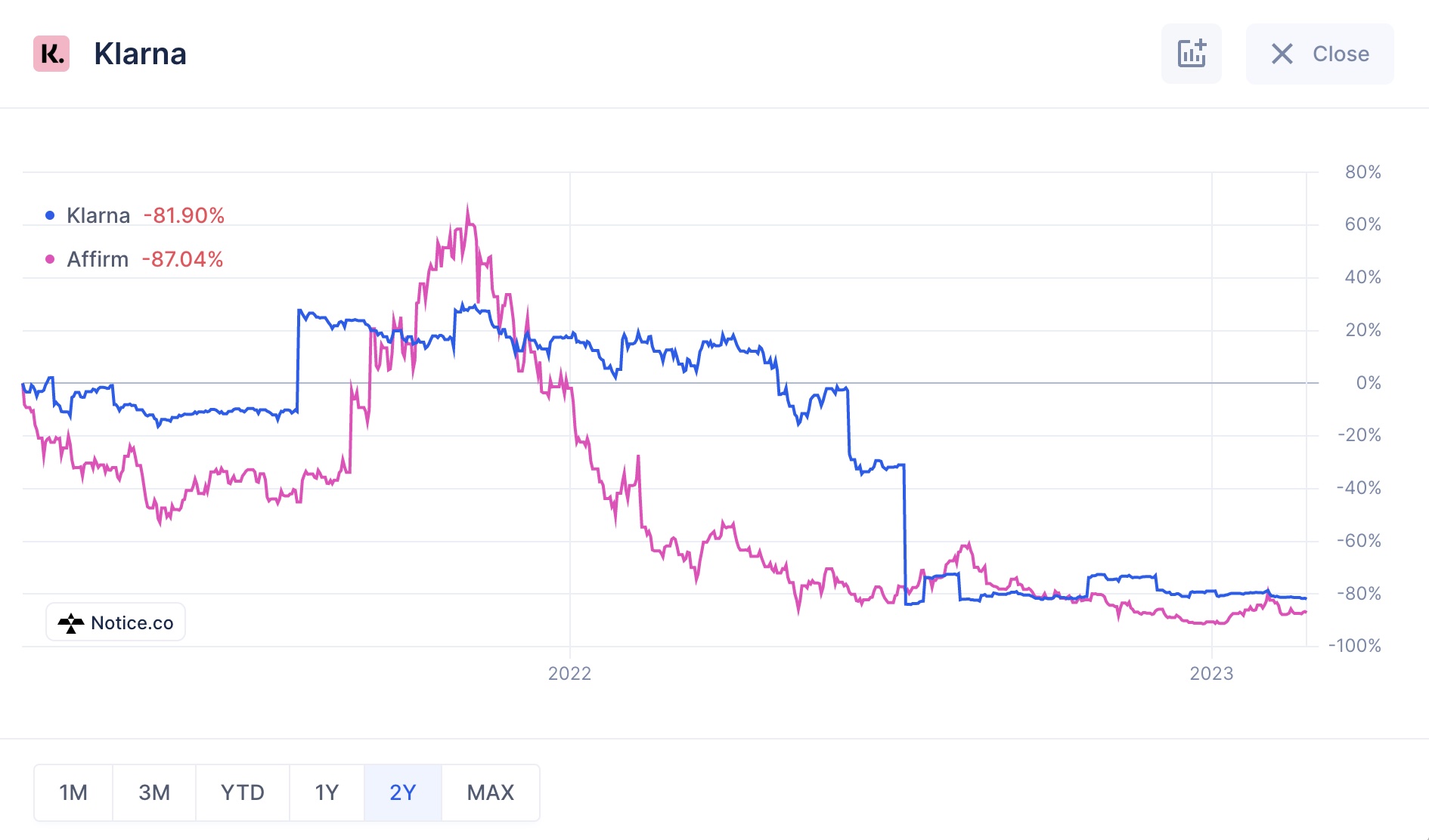 I interviewed Klarna CEO and co-founder Sebastian Siemiatkowski about the Swedish payment giant’s momentum in the U.S. Highlights of the interview, which you can read about in more detail here, include (1) the fact that the U.S. has overtaken Germany as Klarna’s largest market by revenue, (2) the company’s fastest-growing revenue stream is actually marketing, not BNPL and (3) Sebastian really views Klarna and Affirm as being “very different” companies in terms of loan duration and amount. On the topic of Klarna and Affirm, I also spoke this past week with Tyson Hendricksen, CEO and founder of a new company called Notice that tracks secondary market trade activity in the private markets. He told me that based on secondary market activity, Klarna appears to be currently valued at around $7.5 billion, which is actually higher than the $6.7 billion it was valued at last July, but also still significantly lower than the $45 billion it was valued at in 2021. By comparison, Affirm is currently valued at $3.84 billion. Below is a chart Hendricksen provided that illustrates trading activity at the two companies. Affirm is public so the chart shows share price as recorded in the public markets. It also shows a composite price for Klarna that takes into account secondary market trades and open bids and offers. Says Hendricksen: “Think of it as an approximation of the current stock price and valuation using multiple private market data sets.”