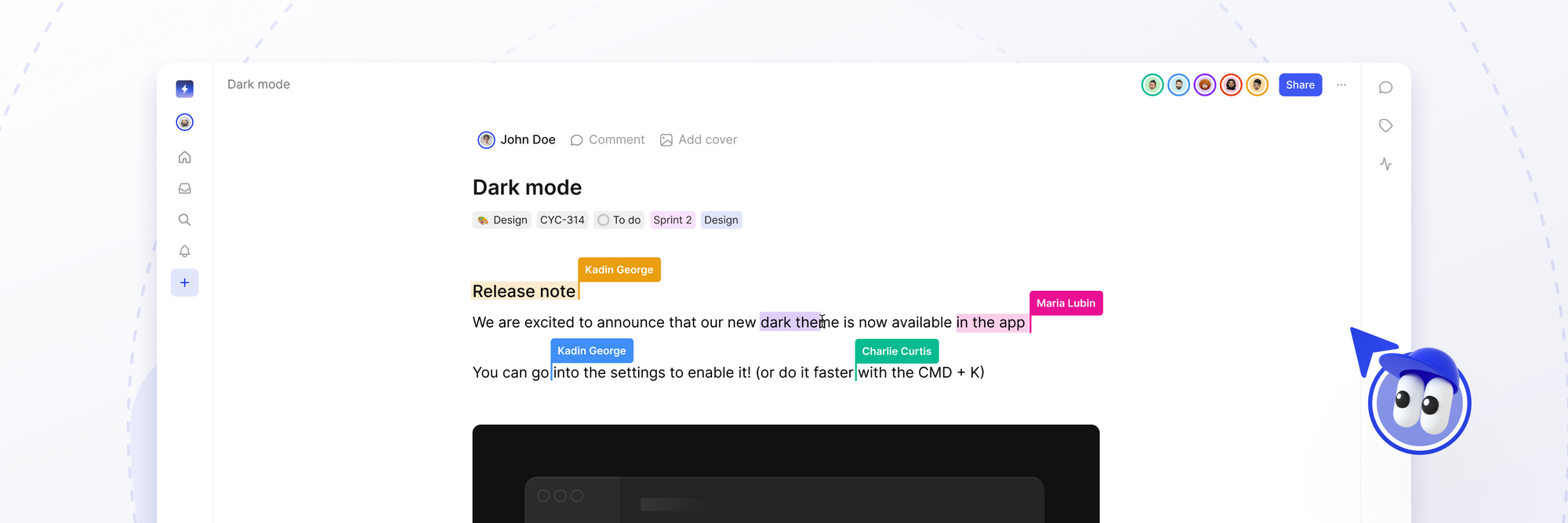 Product managers then use Cycle to write their Product Requirements Documents with a rich-text editor that supports embeds. It’s a collaborative editor with the ability to mention your teammates.