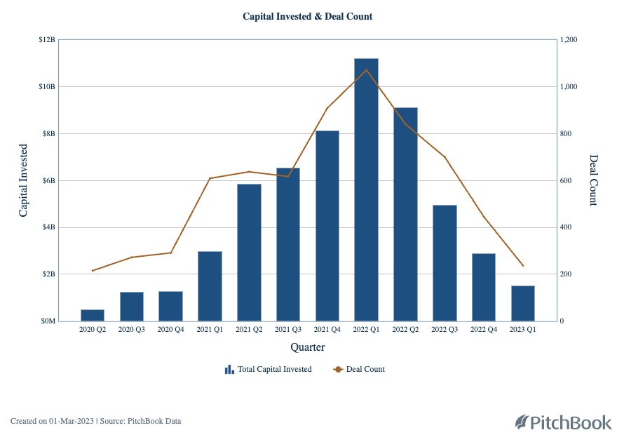 What did we learn? Well, the data indicates that web3 companies’ ability to raise private capital has flatlined to a fraction of its former pace (perhaps by as much as 80% in Q1 2023 if trends hold). The picture for AI-related funding is a bit less clear.