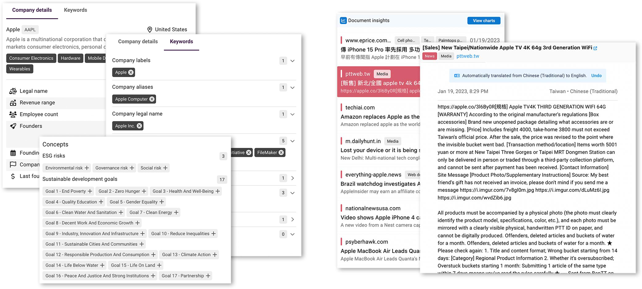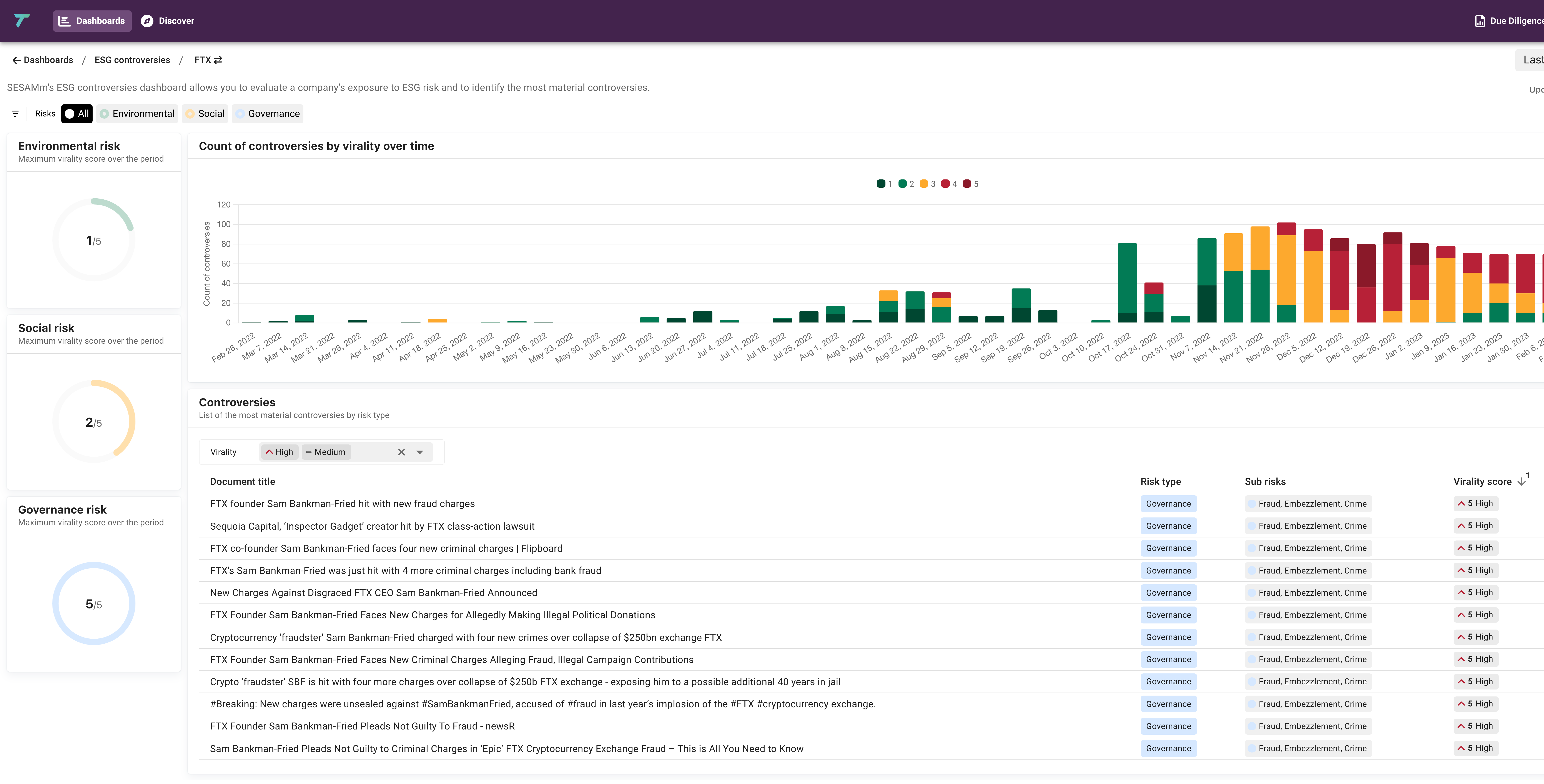 For example, a company that wants to keep tabs on its supply chain partners can use Sesamm to track anything related to those partners that hits the public domain, such as emerging fraud litigation or other lawsuits. This allows them to proactively respond the instant they receive an alert via Sesamm — these ESG alerts, which Sesamm launched a few months back, can be delivered by email or system integrations, for example a customer relationship management (CRM) application.