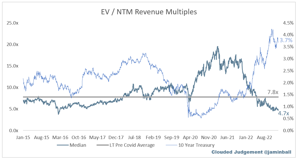 (The above charts, per Ball, are enterprise values for public software companies, divided by their next 12 months’ revenue, in case you want to get granular.) Supposing it’s a bit early for you to run the math yourself, a change from 4.7x to 5.8x is a 23% recovery. That’s incredibly material.