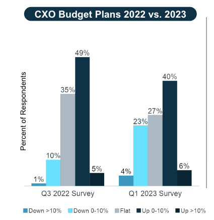 Per the chart on the right, 46% of corporate respondents reported that their tech budgets for 2023 are heading up this year. Another 27% are flat. That leaves just 27% shrinking, with the vast majority of that group sticking to single-digit cuts.