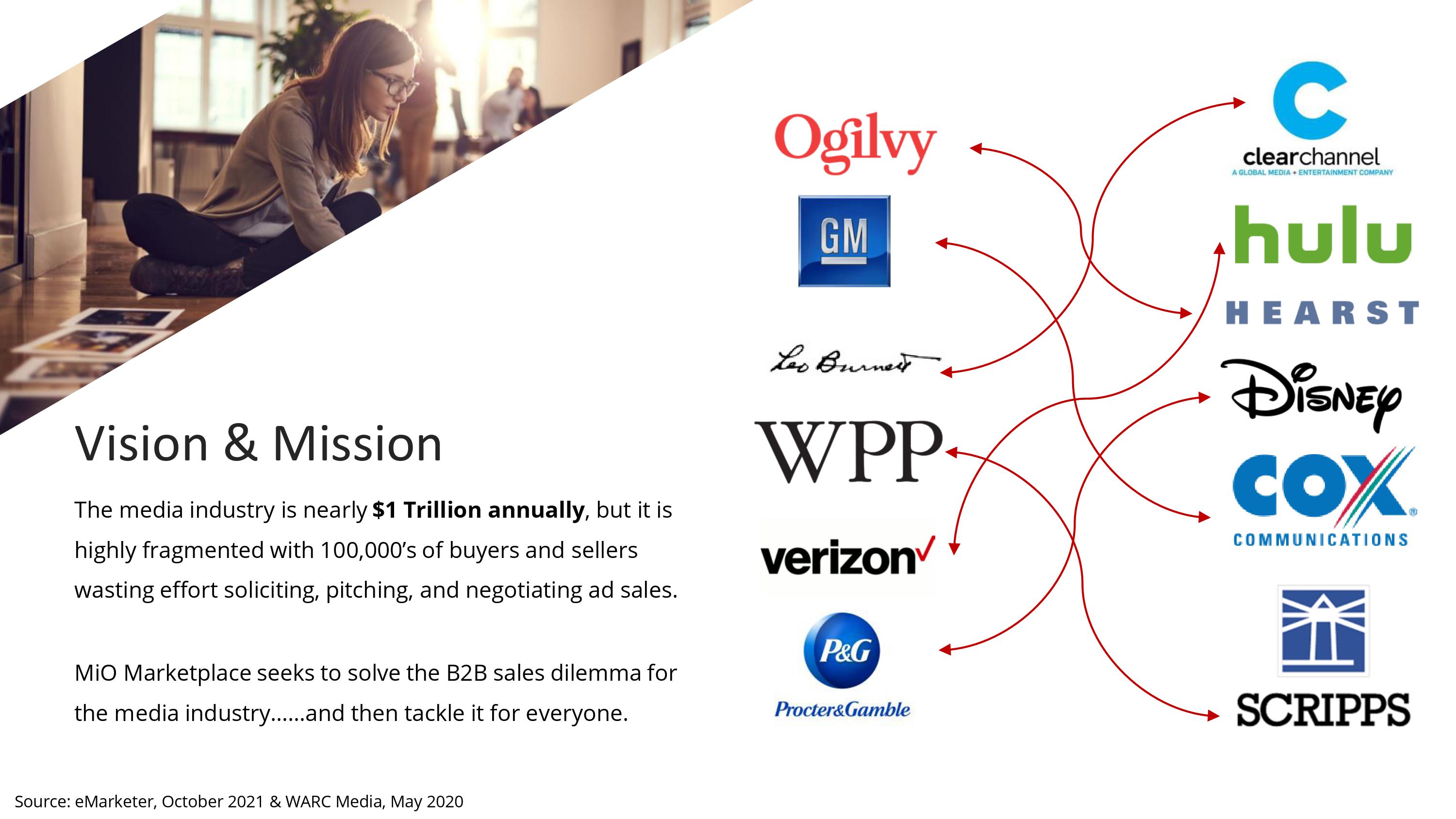 A vision and mission slide can help investors get a good picture of what the founders are trying to do, both in the long and short term. The vision of a single, centralized marketplace where buying and selling takes place is brilliant and extremely bold. If the company can pull it off, though, there’s a huge opportunity for being the eBay of advertising.
