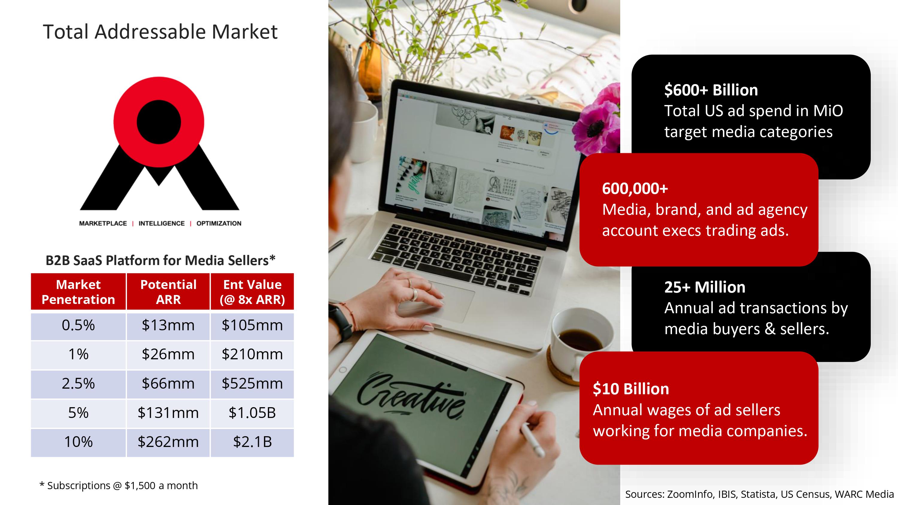 TAM/SAM/SOM calculations are typically done top-down: You start with the biggest number you can reasonably claim and then trim down from there. Above, you’re seeing a bottoms-up approach: You match your product to the market and assume a certain percentage of market penetration. That’s also a fair way of calculating a market size, but you most commonly see this for markets that are nascent and unknown. But advertising isn’t that; it’s a well-established market with a lot of research and reporting annually, so it’s curious to see a bottoms-up calculation here.