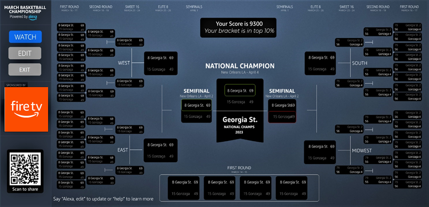 Fire TV users can find the feature via the new dedicated March Madness hub on the home screen or by saying “Alexa, fill my bracket.” They can then select winners for each stage of the tournament and earn points for correct picks. Fire TV will also let users see how well they do against other participants.