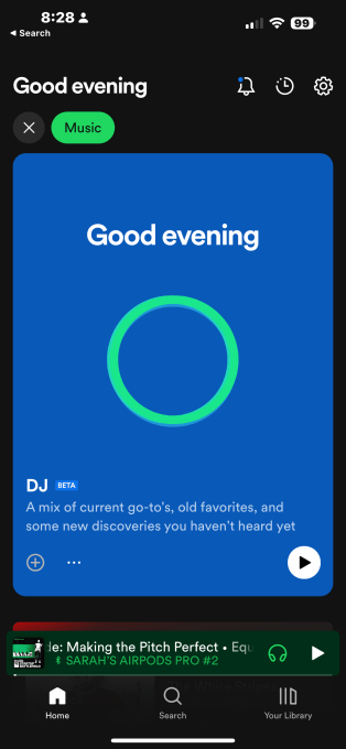 With the app’s revamp, the DJ will appear at the top of the screen under the Music subfeed for subscribers, serving both as a lean-back way to stream favorite music and as a means to push free users to upgrade.