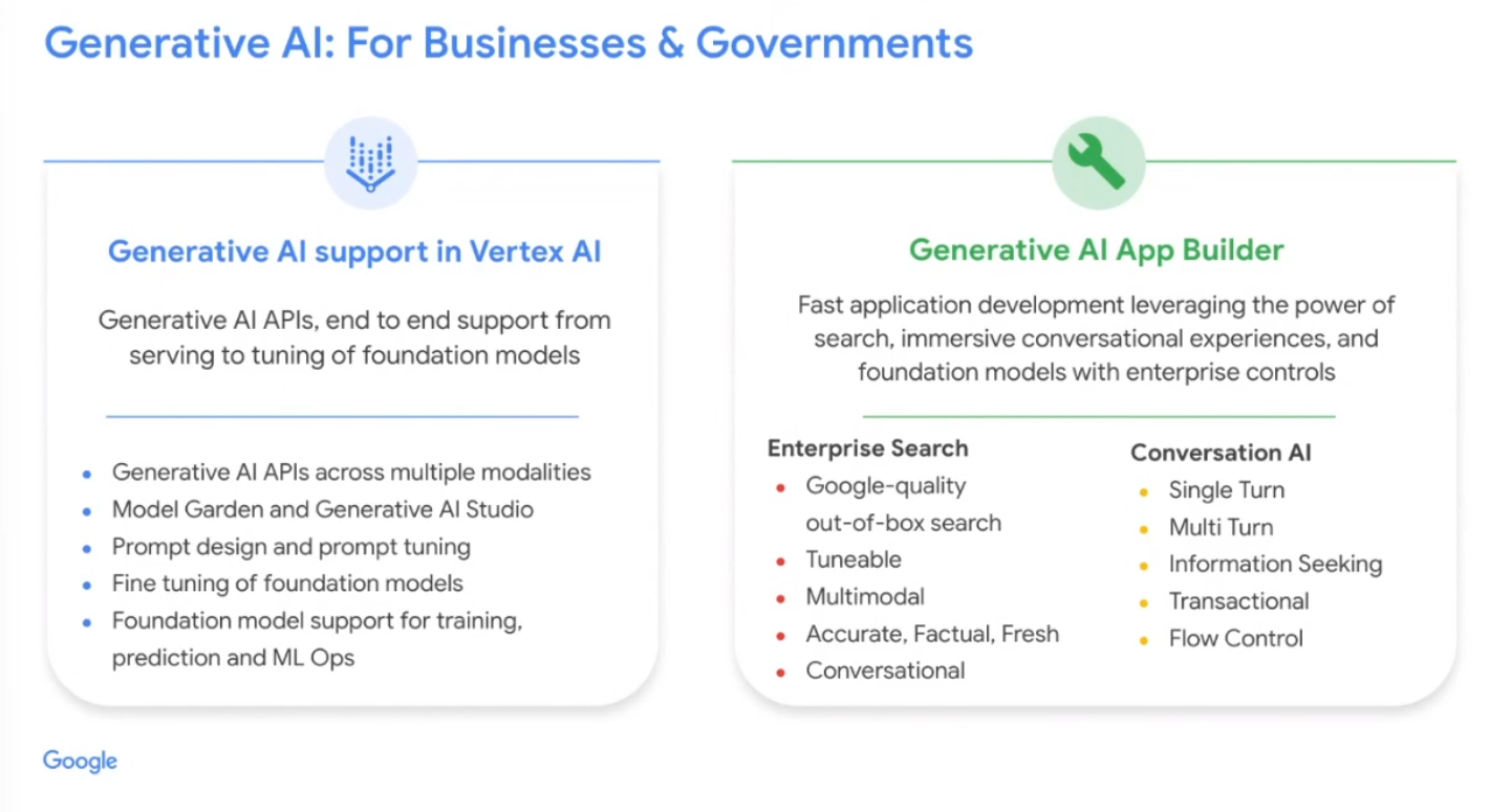 Google is also bringing support for generative AI to Vertex AI, its platform for building and deploying ML models, and launching its Generative AI App Builder, a new service that will help developers ship bots, chat interfaces, digital assistants and custom search engines.