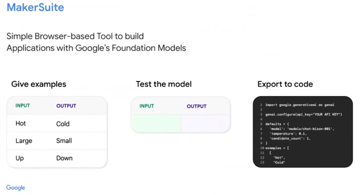 Google Cloud today announced a slew of new AI-powered features for its productivity tools, but the company also today launched a set of new APIs and tools for developers that are just as interesting — if not more so. In addition to making its large language models available to developers through an API, Google also today launched MakerSuite, a new browser-based tool that will make it easier for developers to build AI-powered applications on top of Google’s foundation models.