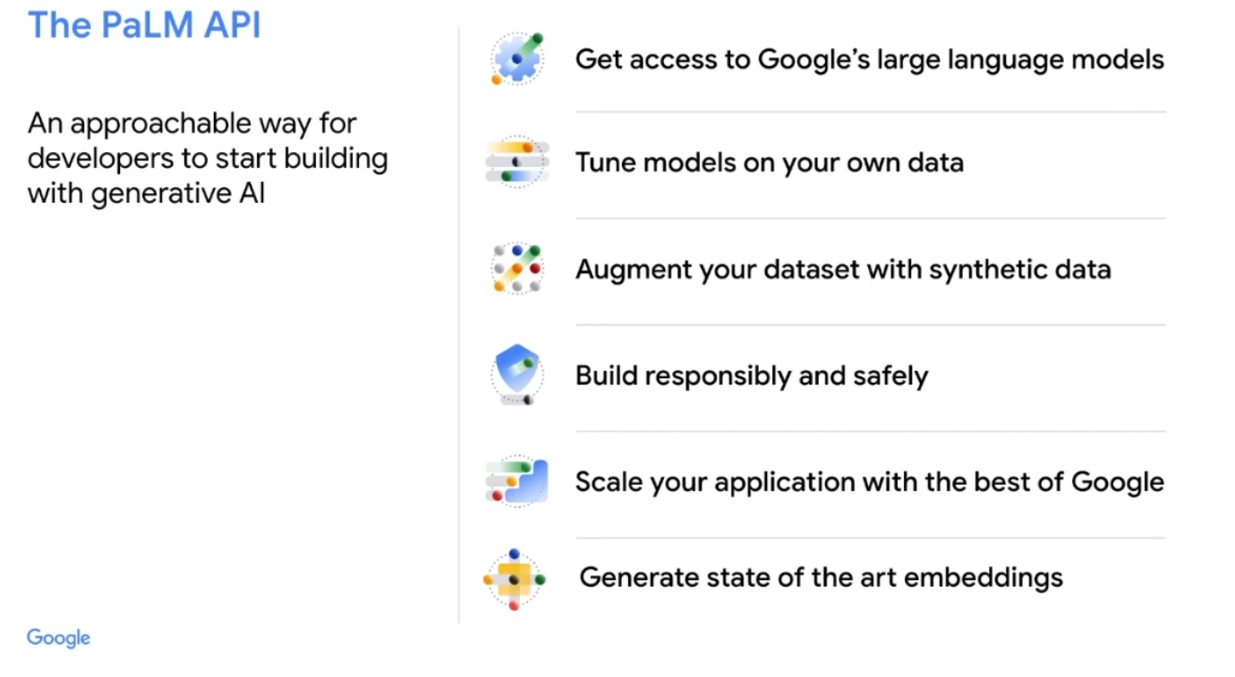 There’s a lot to unpack here, so let’s start at the beginning. The PaLM API is at the core of today’s announcements. While Google has long worked on the PaLM model, the company describes the PaLM API as Google’s gateway to access its large language models in general. “This is the first time we’re taking on new generative AI models and making them directly accessible through an API to the developer community,” Google Cloud CEO Thomas Kurian explained.