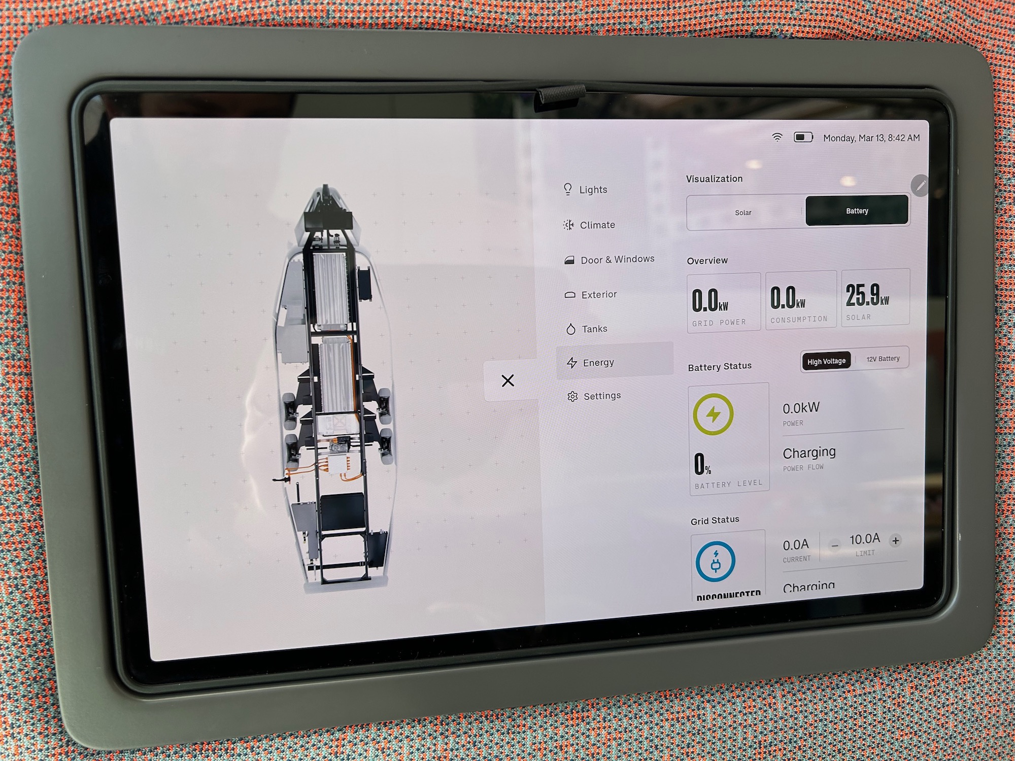 Users can view the battery range, tank levels and solar power via the app. It also controls the lights, doors and windows and climate. It’s also used to raise and lower the travel trailer.