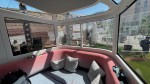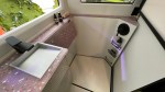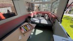 Walking inside, you’ll see a large seating area to the right framed by large bay windows. Underneath is a bed that pulls out and pops up to turn the space into a queen-size bed. On either side of the U-shaped sofa/bed area is a pop up light and wireless charger.