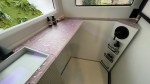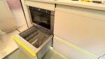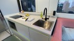 The kitchen is located along the same wall to the left of the dining area. A sink, drawer-style refrigerator and freezer and storage comes first. At the end of the kitchen is a two-burner electric stovetop, spice rack, drawer-style microwave and a dishwasher.