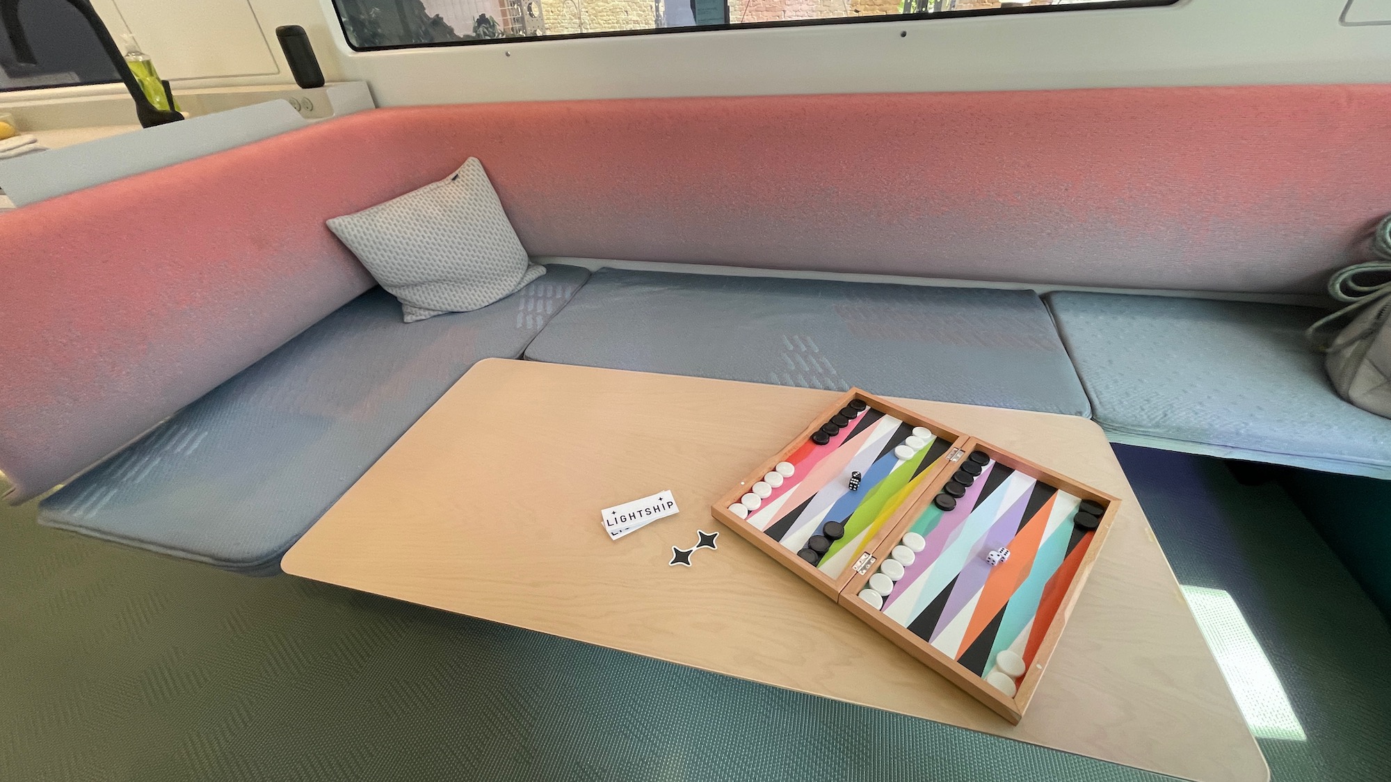 Moving to the middle and left, the bench-like seating continues to a dining or living room area. Storage is located underneath the entire bench. A light wood table sits in the middle and can be automatically lowered to the level of the bench seating. Cushions stored underneath can be pulled out to turn this area into a second bed.