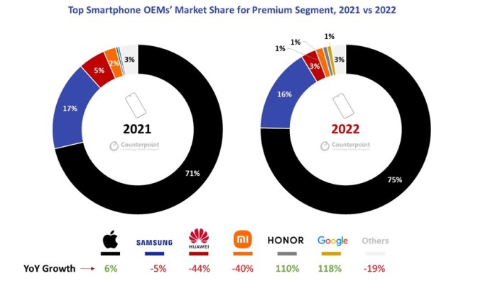 There is no prize for guessing the absolute winner of this market: Apple. The company had a mammoth 75% market share in the premium segment, 6% more than last year. Counterpoint said Apple could have captured even more of the market if it didn’t face supply constraints for the iPhone 14 Pro and Pro Max.
