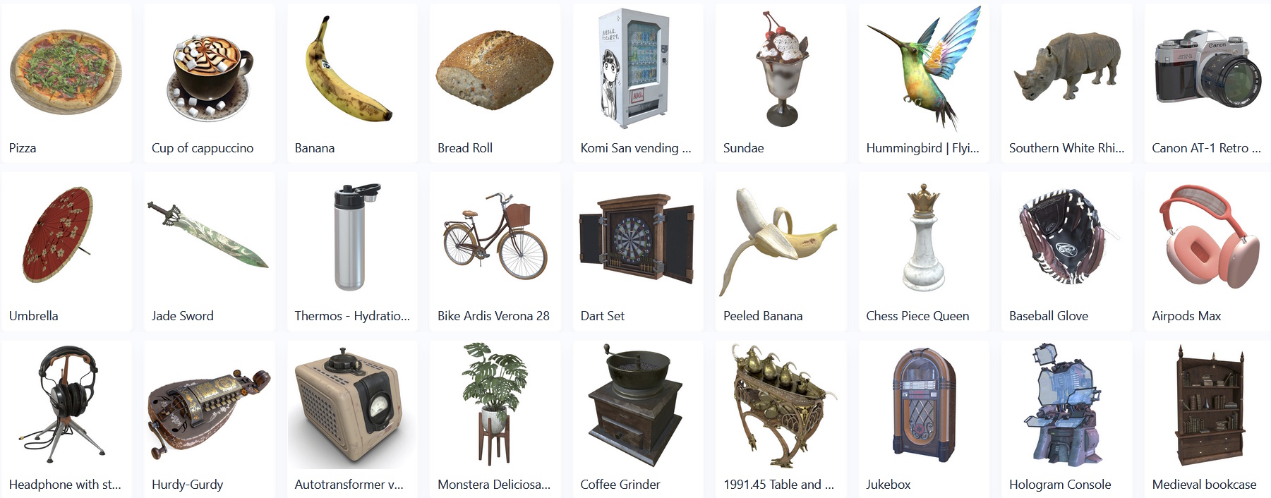 Objaverse, as it is awkwardly yet somehow pleasingly named, aims to improve this with its collection of over 800,000 (and growing) 3D models with all kinds of metadata. The things represented range from types of food to tables and chairs to appliances and gadgets. Any relatively ordinary object you might expect to see in a home, office or restaurant is represented here.