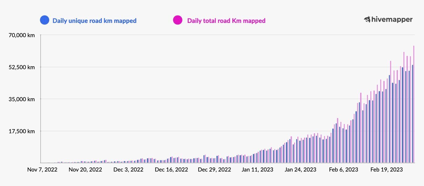 Hivemapper said Thursday it collected more than 1 million kilometers (about 620,000 miles) of unique street-level imagery. Compared to Google’s 60 million kilometers, that’s small potatoes. However, Hivemapper collected this data over the last three months. It took Google from 2007 to 2019 to collect 16.1 million kilometers of unique road data.