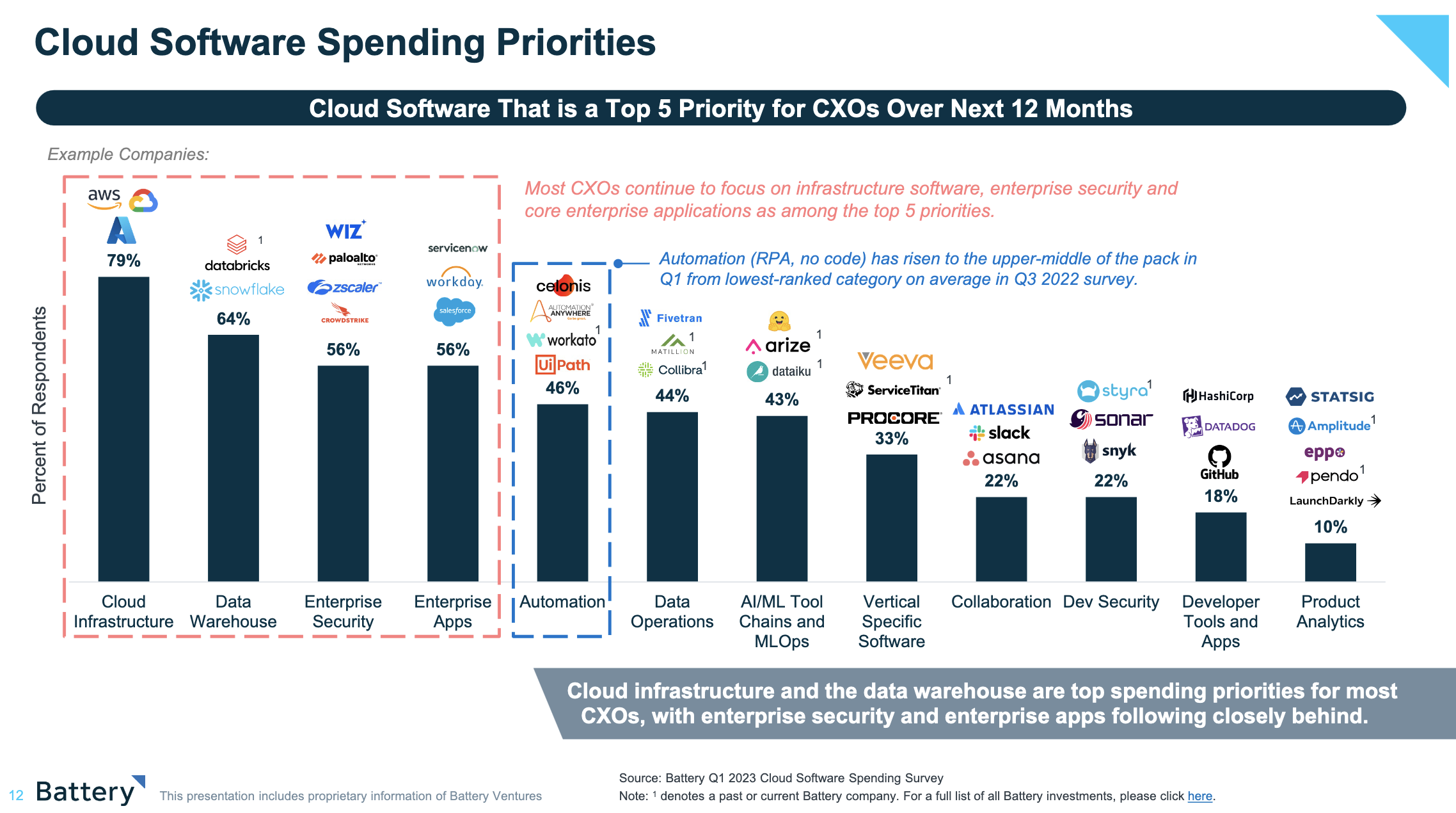 Battery’s report is based on a sample of CXOs it periodically surveys about their cloud software spending. In Q1 2023, 46% of respondents mentioned automation as one of their top five priorities, which is definitely noteworthy. (Although we understand that it is less than in August 2022, where it added up to 58%, the VC firm points out that it has increased compared to Q3 2022 findings we couldn’t immediately access.)