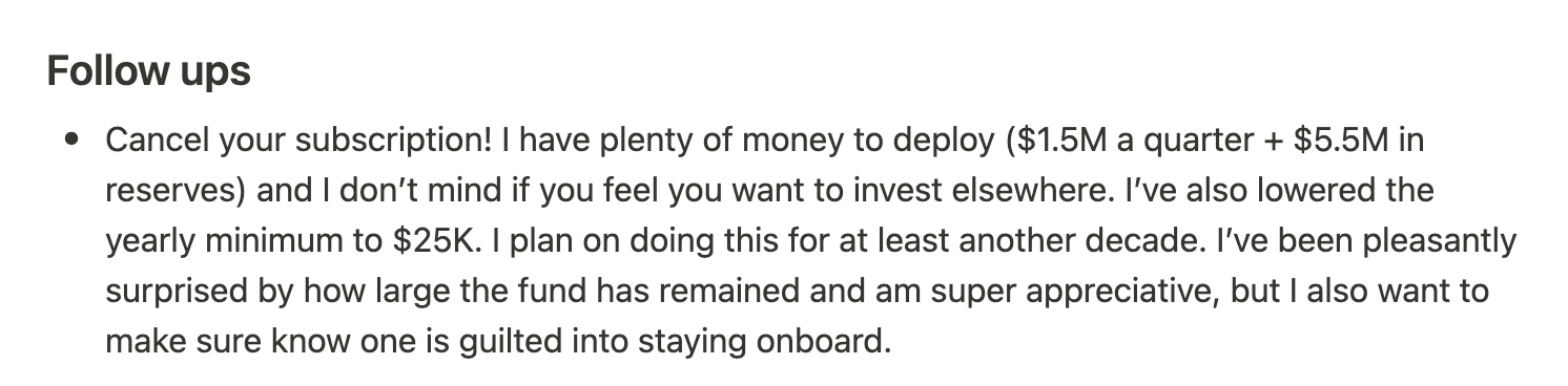 The environment has changed so much that this week, he sent an email to LPs with a simple bullet point toward the end: “Cancel your subscription.” The reason, he tells TechCrunch+, is because the venture math has changed and he doesn’t want investors to feel guilty over a commitment they made months — or even years — ago.