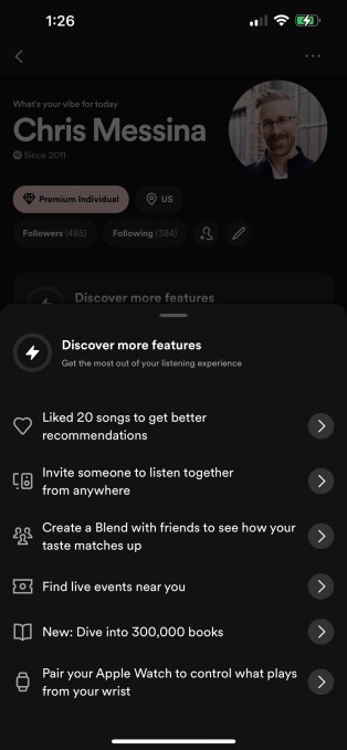 Under the “Discover more features” section on the new profiles, users are pointed to other things they can do on Spotify — like find live events, “like” more songs to improve their recommendations, create Blends with friends, check out Spotify’s new audiobooks and more.