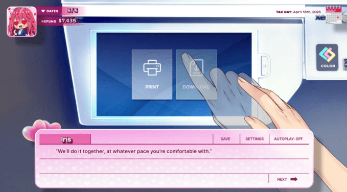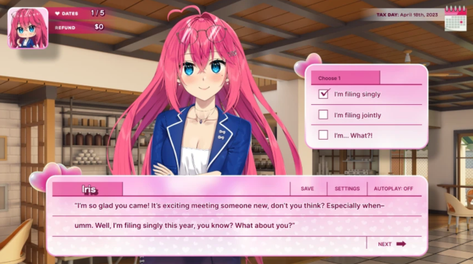In Tax Heaven 3000 (or TH3K, for those initiated), you have just moved to a new town, and you don’t know anyone. You need to buy a pencil to fill out some forms for your new lease, but — oh no! You’ve bumped into a pink-haired anime girl named Iris! You hit it off, despite the fact that she immediately asked you if you’re a U.S. resident, which your character describes as a “weirdly nationalist” first impression. You meet up for coffee later, where she asks you more about yourself, like whether you’re filing taxes single or jointly, your employment situation, your phone number and if you’ve invested in crypto (if that’s the case, she abruptly leaves and the game ends).