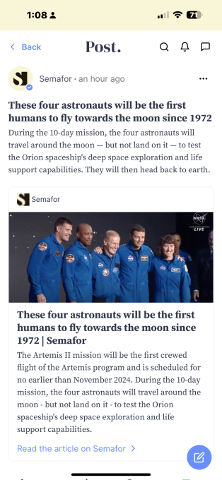 At launch, Post has signed up partners including The Boston Globe, The Brookings Institution, Fortune, The Independent, Insider, LA Times, NBC News, Politico, ProPublica, Reuters, Semafor, SF Chronicle, MIT Technology Review, USA Today, Wired, World Politics Review and Yahoo Finance.