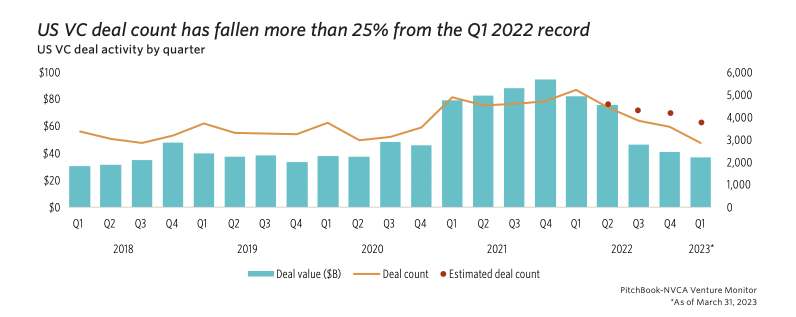 What to know: Overall deal count in the U.S. has fallen more than 25% between the first quarter of last year and this year. Fewer than 3,000 deals were closed between the start of the year and the end of March, which doesn’t sound so terrible until you realize things haven’t been so slow, comparatively, since 2018 (see chart below).