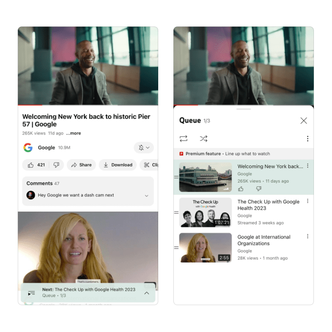 Another new feature provides more controls over your queue when subscribed to YouTube Premium. Starting today, Premium users will be able to add videos to their queue when watching on phones and tablets. While today YouTube free users can save videos to playlists, including “Watch Later,” queuing lets users control what video they want to play next during their current viewing session.