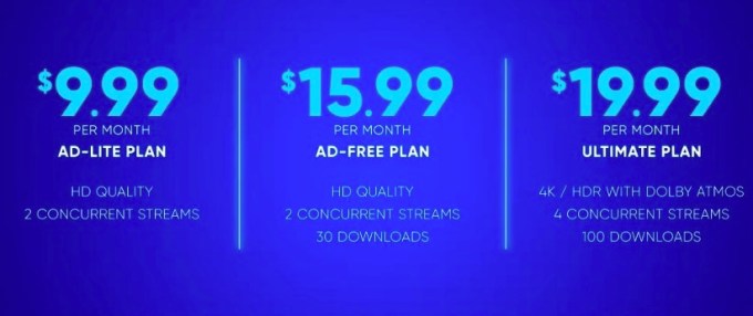 The new service will offer three pricing tiers, starting at $9.99 per month for ad-supported, $15.99 per month to go ad-free and $19.99 per month for ad-free viewing with 4K UHD and Dolby Atmos. The latter two tiers also include offline downloads but are limited to either 30 or 100 downloads, respectively. The top-tier service also includes four concurrent streams instead of just two.
