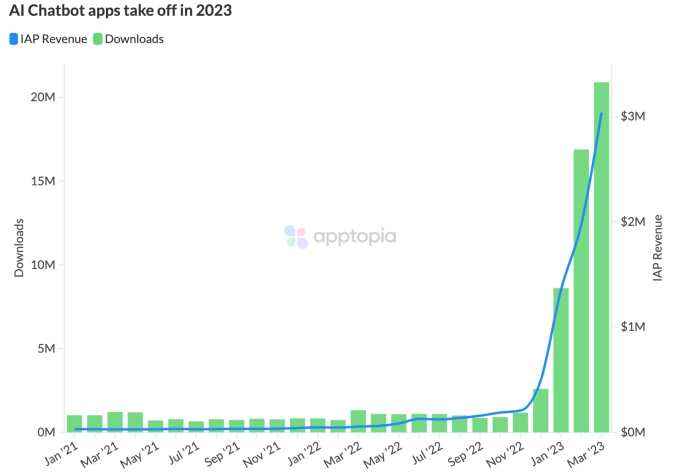 - User spending on AI apps increased by more than 4,000% year-over-year, according to Apptopia data. Downloads also increased by 1506% year-over-year, reaching nearly 20 million in March. Multiple similarly named apps like Nova AI, Genie AI and Chat with Ask AI have broken into top charts. Chat with Ask AI was on the top 10 free apps list on iOS in multiple countries.