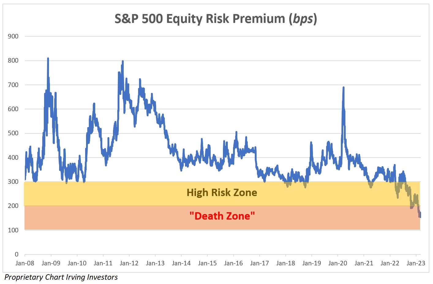 Simply put, equity risk premiums (ERPs) have broken down well below the ranges that were established since 2008. The ERP calculates the projected S&P returns versus the returns of 10-year treasury bills (data from Morgan Stanley).