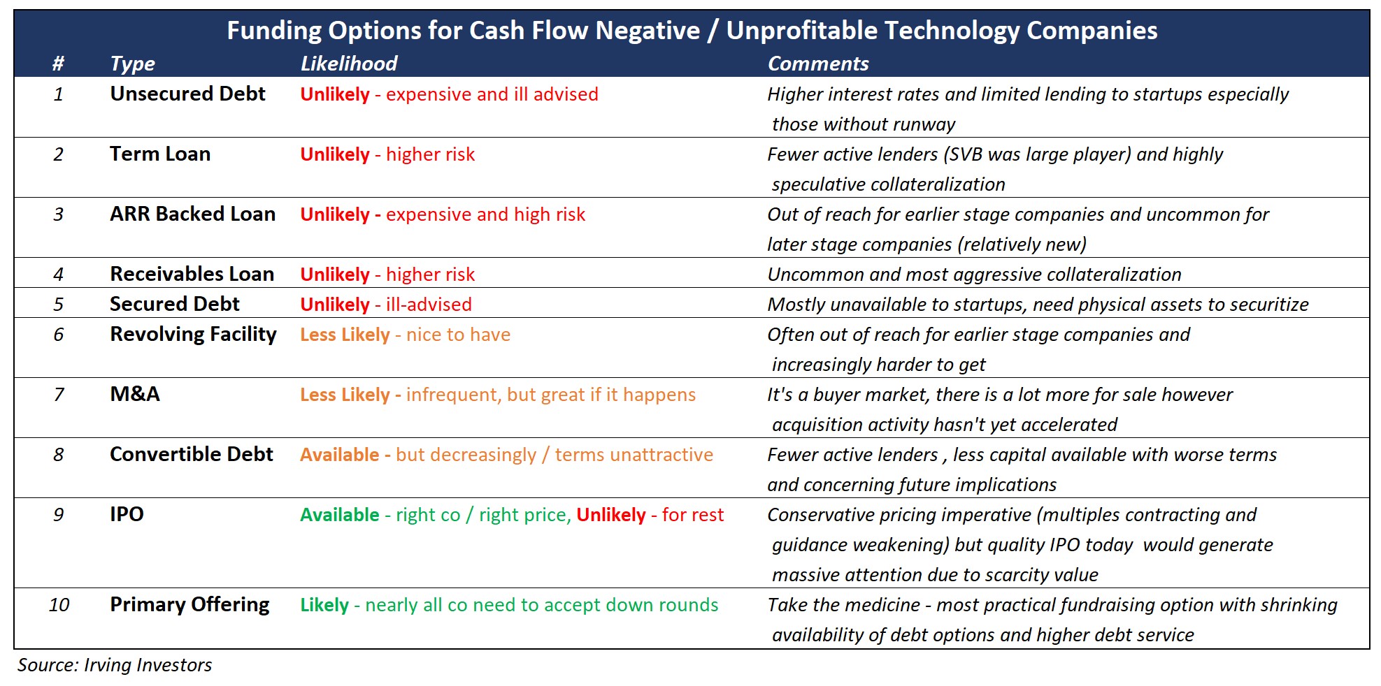 That rationale can be crippling for unprofitable companies; the success of the debt instrument for both the borrower and lender is solely based on the company’s ability to raise equity in the future to pay down the debt.