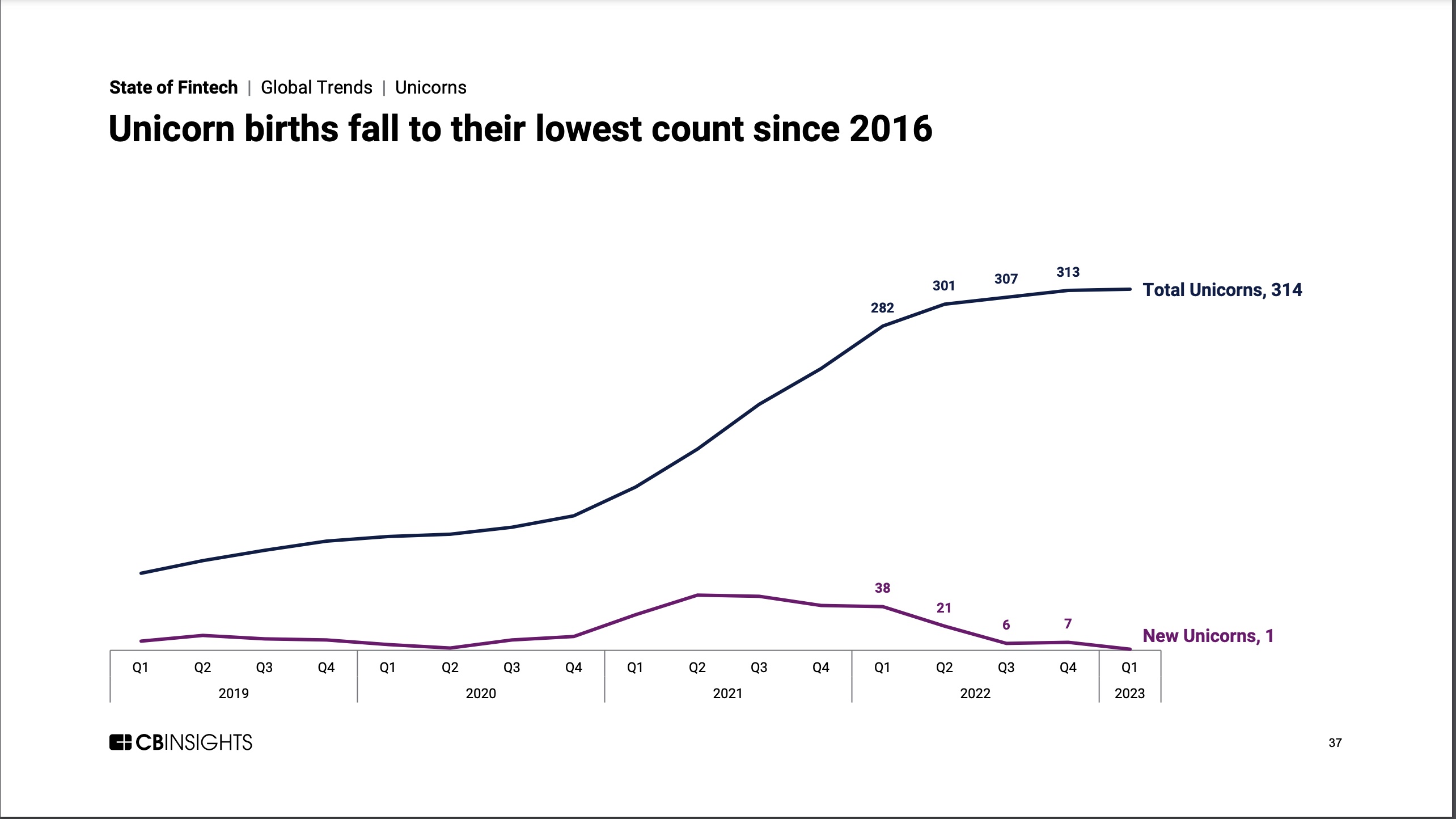 - There was just one unicorn birth in the entire quarter. This is the first time that has happened since the end of 2016. The only unicorn born in Q1’23 was Egypt-based MNT-Halan, which in early February raised $260 million in equity financing at a $1billion valuation. But overall, according to CB Insights, the total fintech unicorn herd still stood at 314 in Q1’23, up 11% YoY.