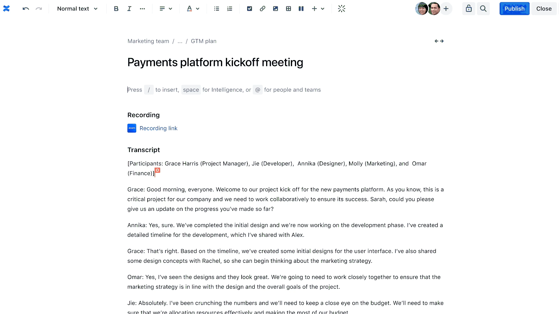 For the most part, though, Atlassian Intelligence provides users with a Chat-GPT like chatbox that’s deeply integrated into the different products and that allows users to reference specific documents. For instance, if you want it to summarize the action items from a recent meeting, you only have to tell it to generate a summary and link the document with the transcript in order for it to generate a list of decisions and action items from this meeting — and you can do that right inside of Confluence, for example.