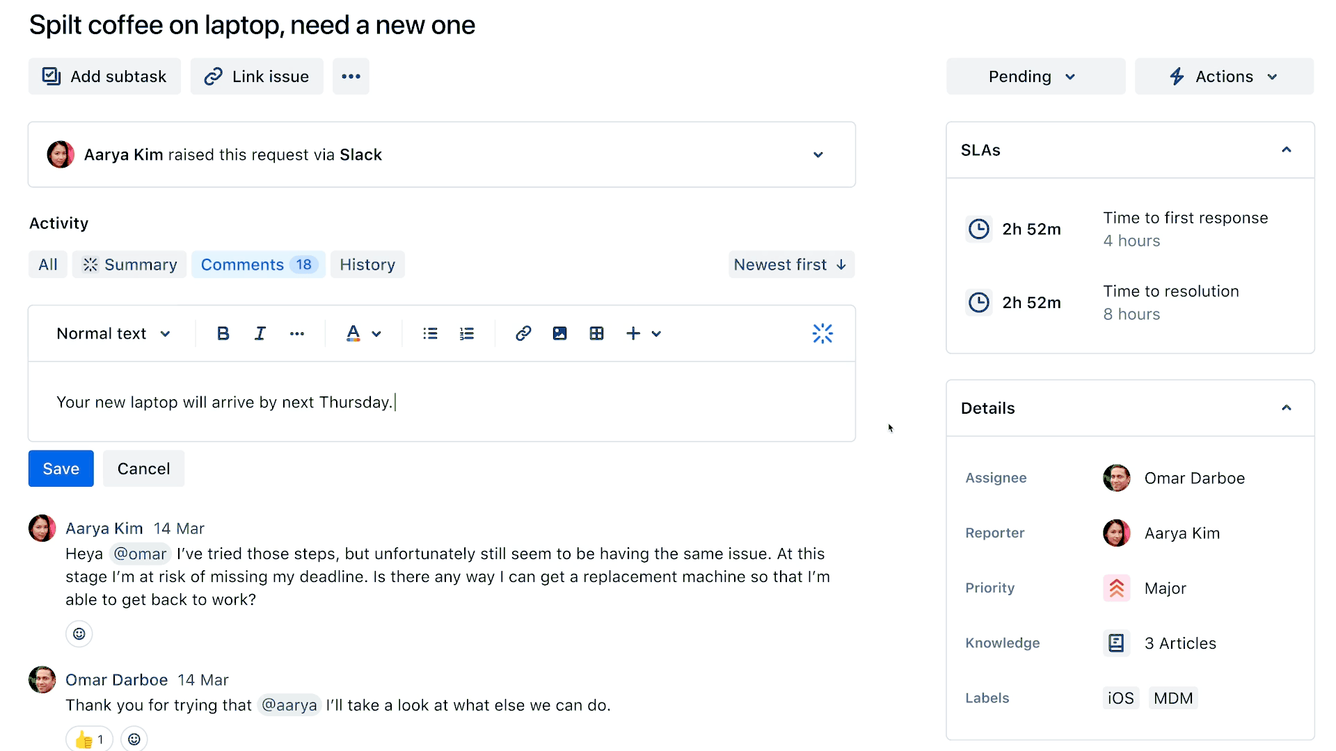 Users of Jira Service Management, though, may be the most likely to save time with Atlassian Intelligence. Here, users can now use a virtual agent to help automate support interactions right from inside Slack and Microsoft Teams. This new agent will be able to pull up answers from existing knowledge base articles for both agents and end users, for example, and it will also quickly summarize previous interactions for newly assigned agents to bring them up to date on a given issue.