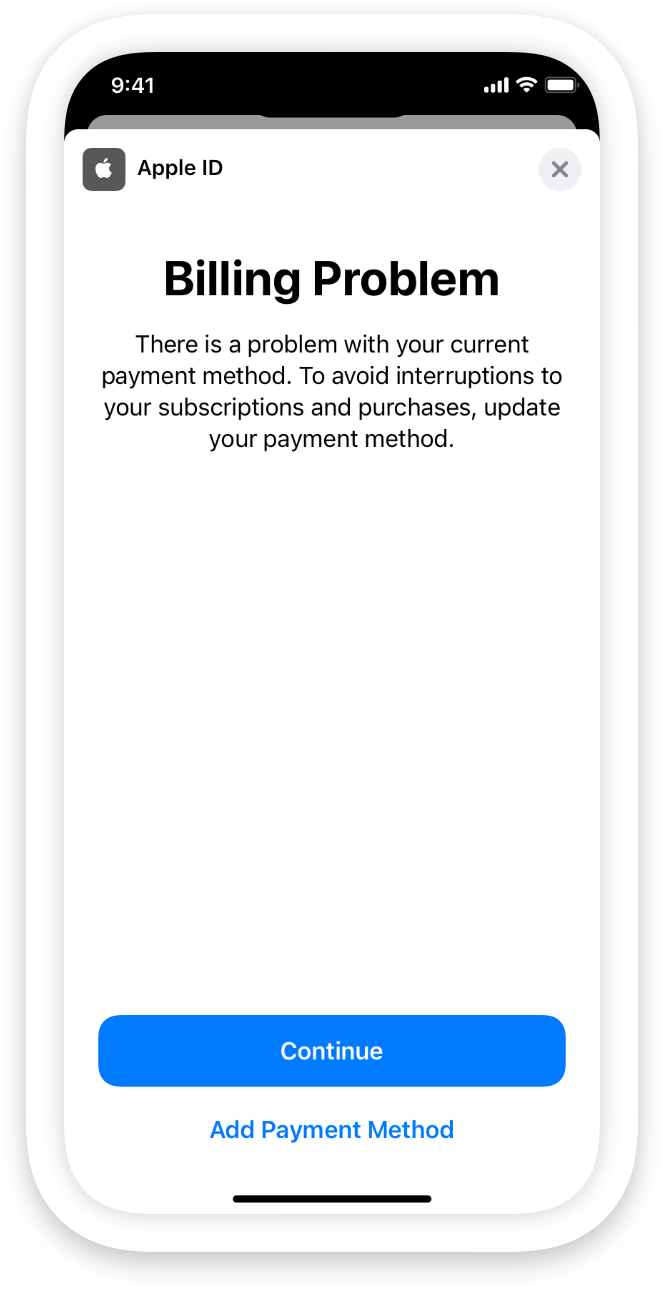 The sheet advises the app’s user there “is a problem with your current payment method” and that they need to update it to “avoid interruptions to your subscriptions and purchases.” Users can then press the big blue “Continue” button at the bottom of the screen to proceed to update their method of payment — for example, entering the new expiration date for a credit card after the older one expires. There’s also an option to “Add Payment Method” to switch to a new card.