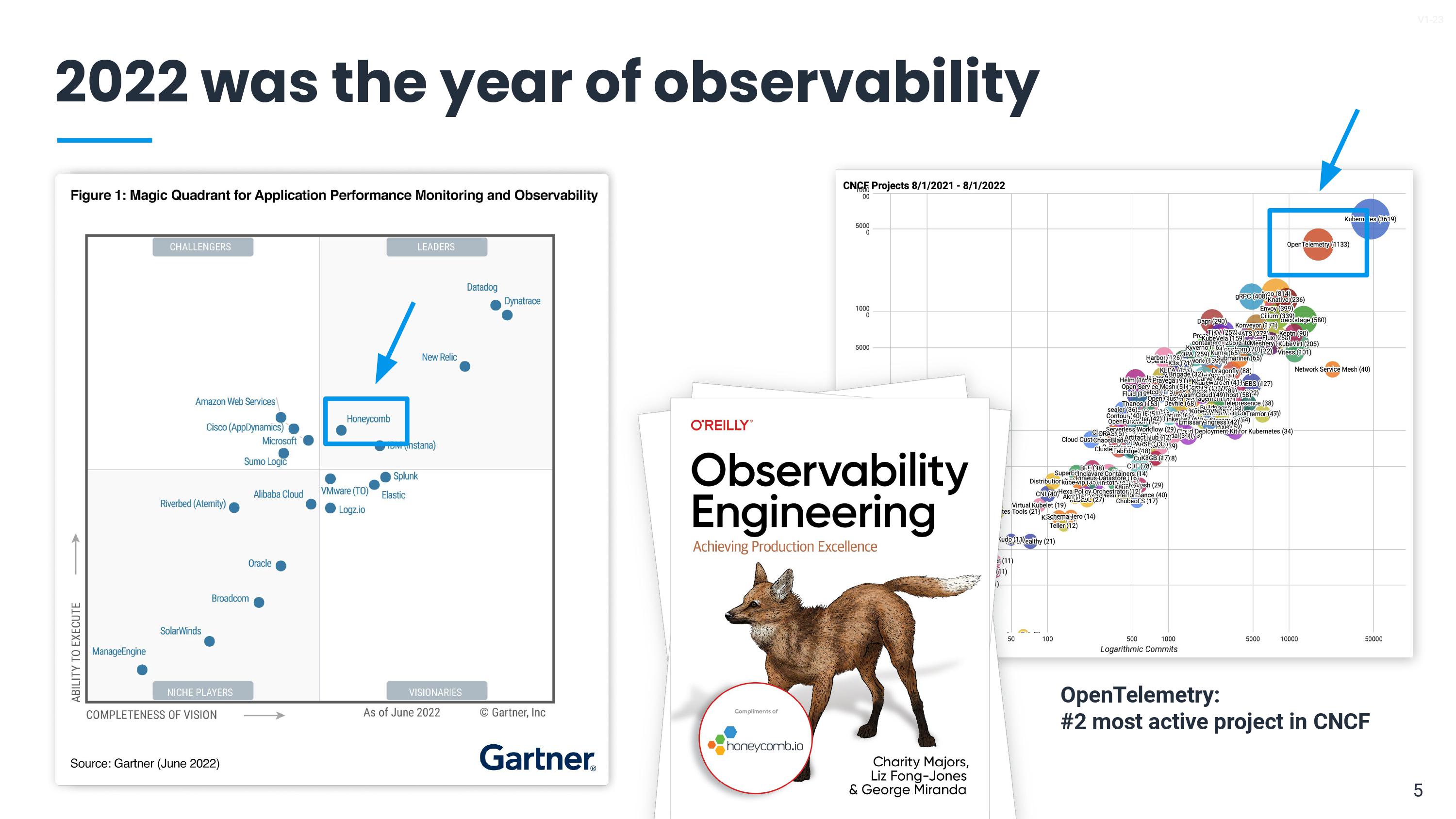 In the middle, there’s an O’Reilly book, “Observability Engineering,” that has a sticker on it that says “compliments of Honeycomb.io.” Even after reading the description of the book on its website, it’s still confusing: Is this an independently published book, or is it essentially a marketing exercise published via O’Reilly? Without doing additional research, I can’t really tell whether the book is essentially a vanity metric (we hate those), or a legitimate entry into the discourse for this particular market. Perhaps I’m biased, because I know a fair bit about publishing but just sticking the book cover on this slide and calling it a day leaves me with questions.