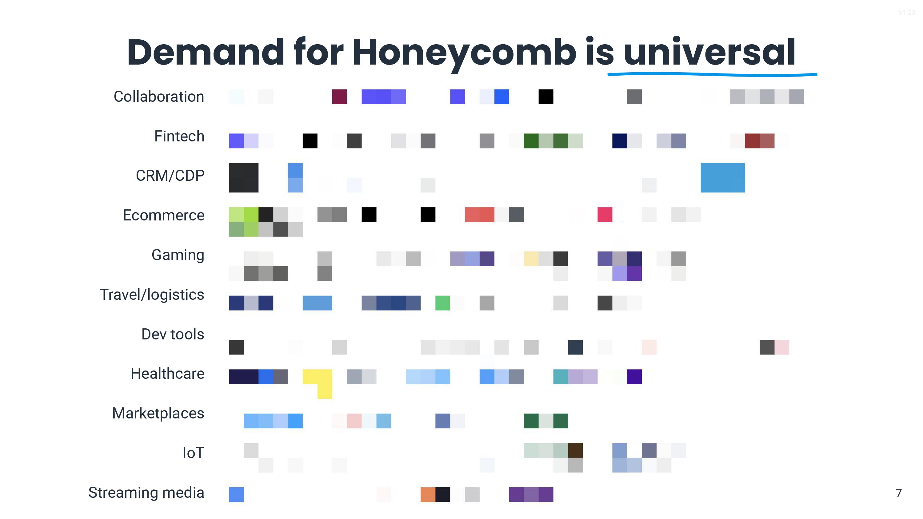 Trust me when I say that there are some serious, well-known brands on this slide. But even with the logos blurred out, this slide does a magnificent job telling the company’s story: It shows the breadth of companies and sectors that work with Honeycomb. “Who is this product for?” is a question all investors will ask, and with this slide, it’s clear that the answer is: mostly everyone.
