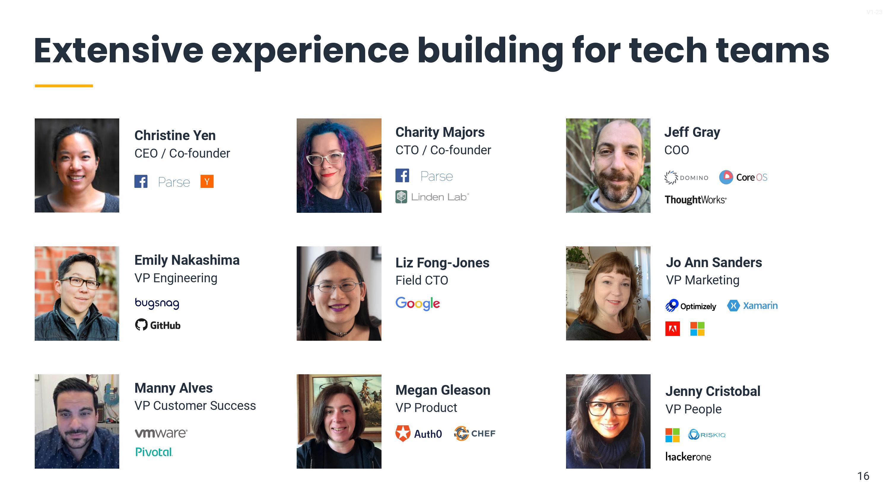 OK, for a team slide, this isn’t great: It doesn’t explain why all of these people have a founder/market fit, and it doesn’t show why this team is uniquely positioned to drive Honeycomb to the next level. Specifically, for a round that suggests an IPO might be imminent, I want to know that at least some of the folks in leadership know how to pull that off or at least have support from people who have IPO experience.