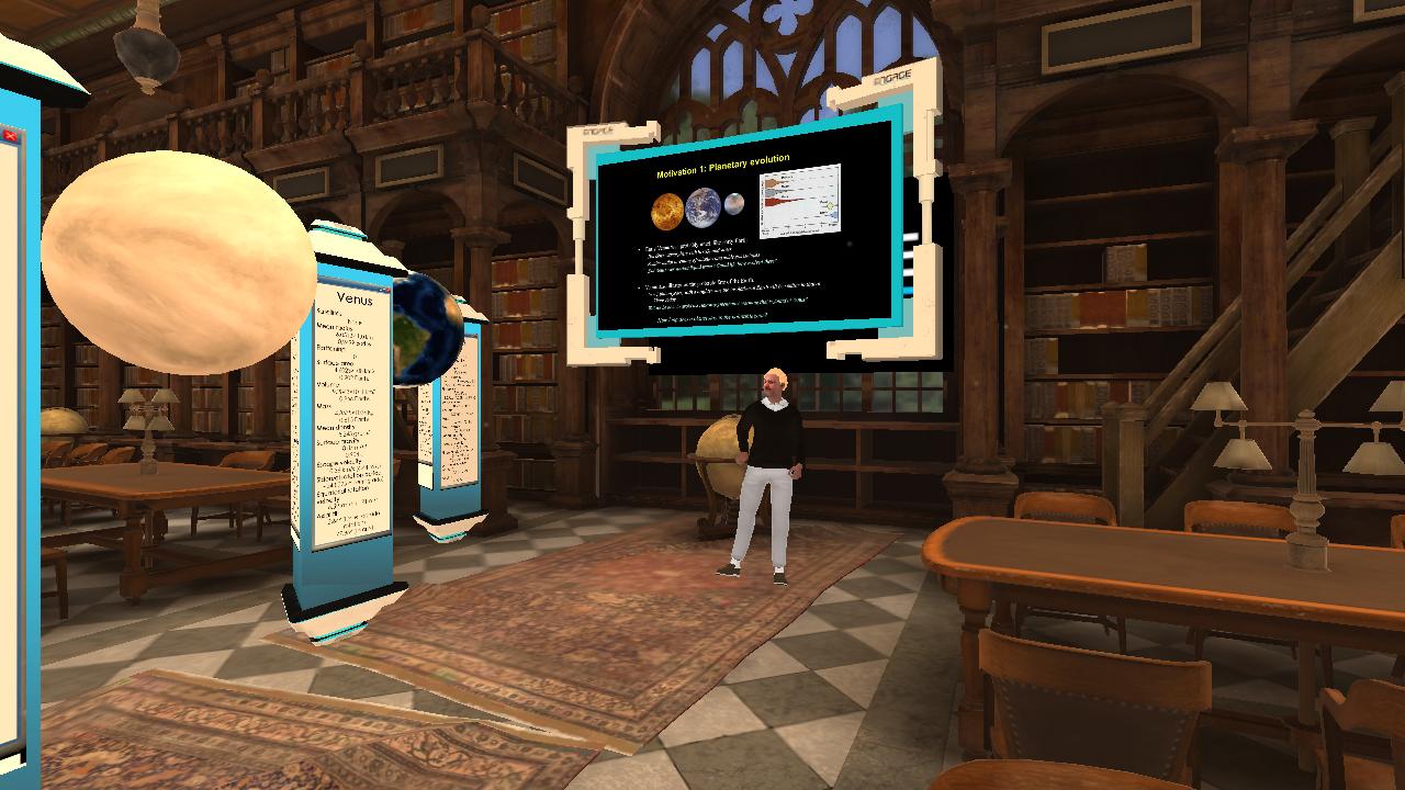 Universities are using Engage both to learn more about VR and the metaverse, and to access immersive courses. For example, I sat in on an Oxford University lecture set in a replica of the university’s Bodleian Library about Venus that included hovering models of planets rotating in a virtual library.
