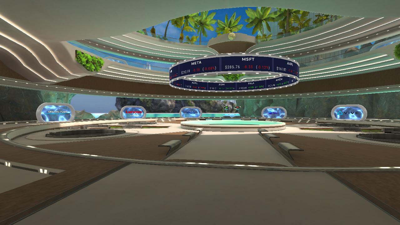 The space looks like an airy billionaire’s lair, a circular two-floor structure with rocky walls, plenty of round conversation pits and palm trees up above. Upon arrival into the plaza, I could hear some kind of elevator music, but also the faint sound of TV news. As I walked closer to the center, where a floating screen rotated with live stock prices for tech companies like Apple, Microsoft, Nvidia and Google, the voices got louder and I soon noticed that another screen hovered on the second floor playing Bloomberg Live.