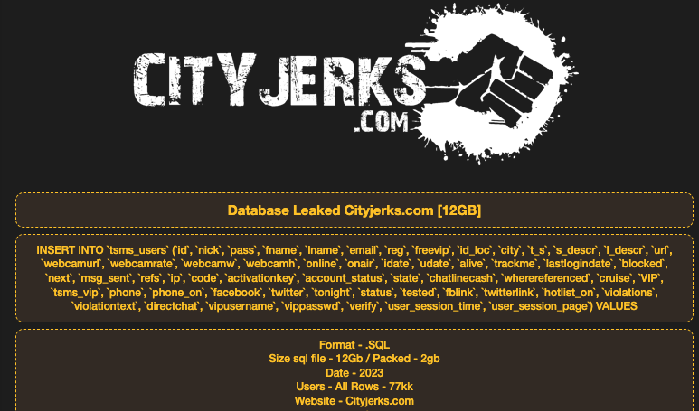 In a post advertising the data stolen from TruckerSucker, the seller claims the database contains information on 8,000 users. In the post about CityJerks, the seller claims the database contains data from 77,000 users.