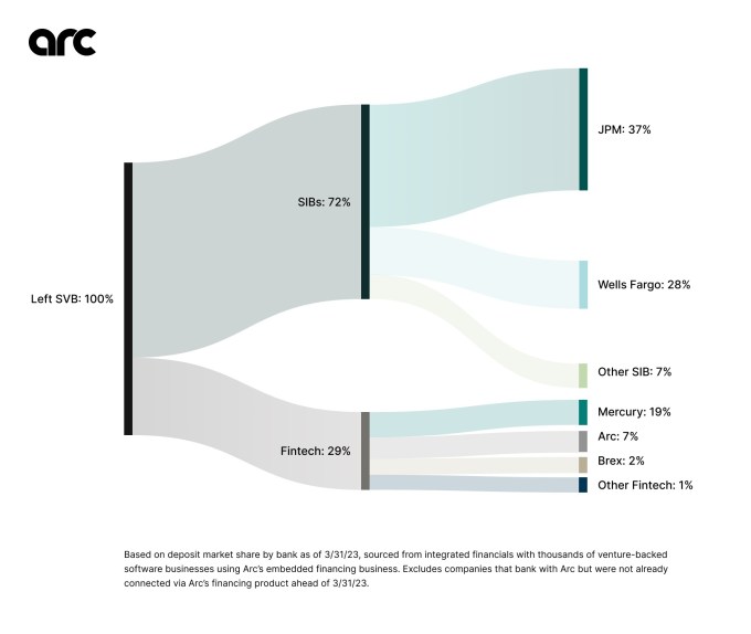 “The writing has been on the wall for First Republic since SVB went down,” he told TechCrunch+. “Most of these deposits had already left FRB before the announcement was made that they had lost $100 billion in deposits.” According to data analyzed by Arc, the “lion’s share of deposits” in the first quarter went to JPMorgan Chase, or about 37%; another 28% went to Wells Fargo, and the remaining 30% was split among startups Brex, Mercury and Arc, each taking about 2%, 19% and 7%, respectively.