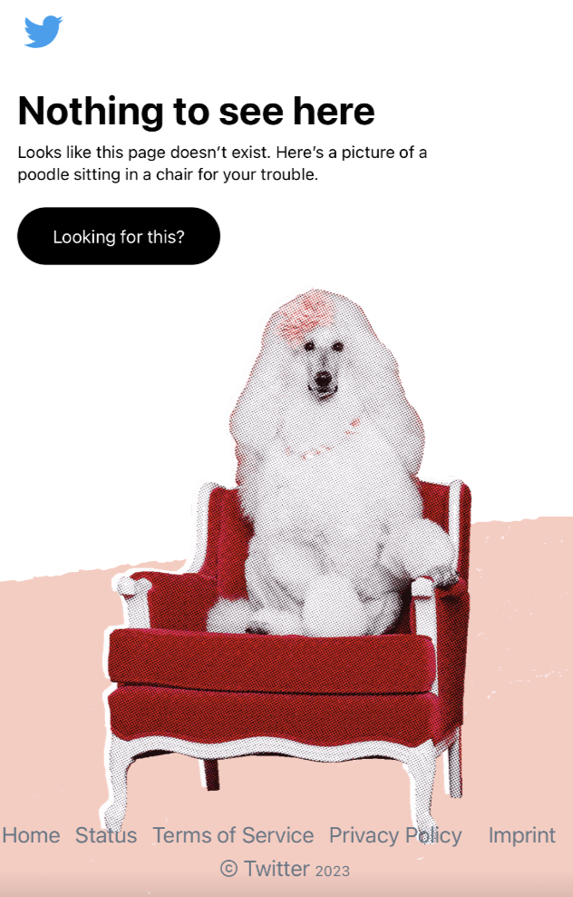 Once you open the web page on your phone, you’ll see a notice that says “Nothing to see here” with a blurb that says “Looks like this page doesn’t exist. Here’s a picture of a poodle sitting in a chair for your trouble.”