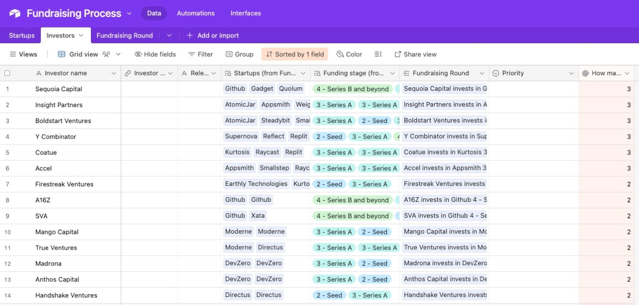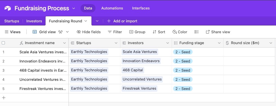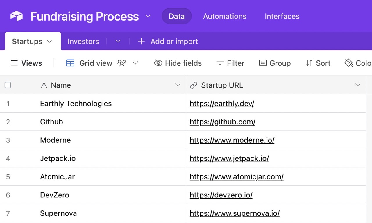 Again, use whichever tool you want. I’m using Airtable, so as I add the data for the various investors, the startups and investors lists are also populated. This will come in handy for our next step.