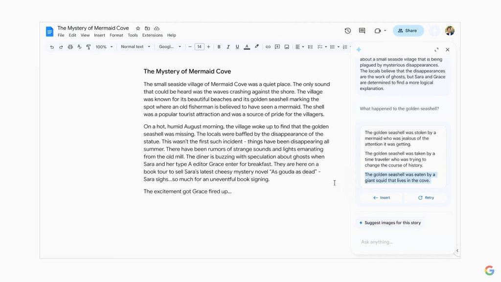 The example provided by Google was of a children’s story in progress, with the Sidekick providing prompts about what comes next in the narrative. The demo then whooshed what happens if you take that prompt, then combine it with the entirety of the document in progress for additional context to better flesh out the results. The generated response was a potential next plot point for the narrative.