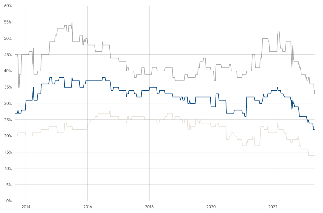 If you haven’t: The blue line is the median figure for companies in the index, and it’s at an all-time low since the inception of the index.