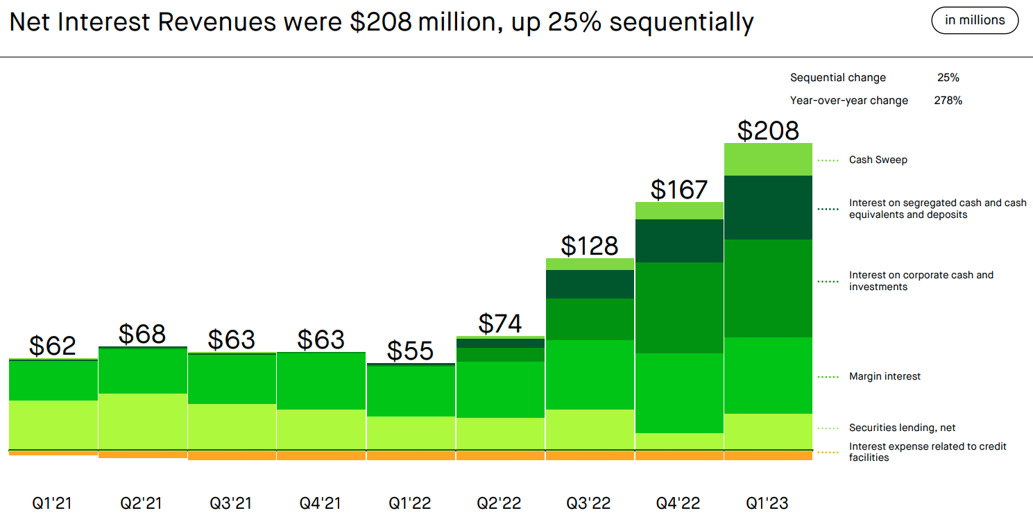 Per Robinhood, the gains in interest revenue were “driven by growth in interest earning assets, increased securities lending activity, and higher short-term interest rates.”