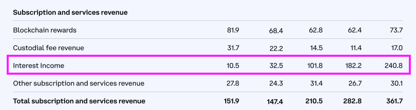 Next, we have Coinbase. Here’s how the company described its rising interest-based revenues in its earnings report: