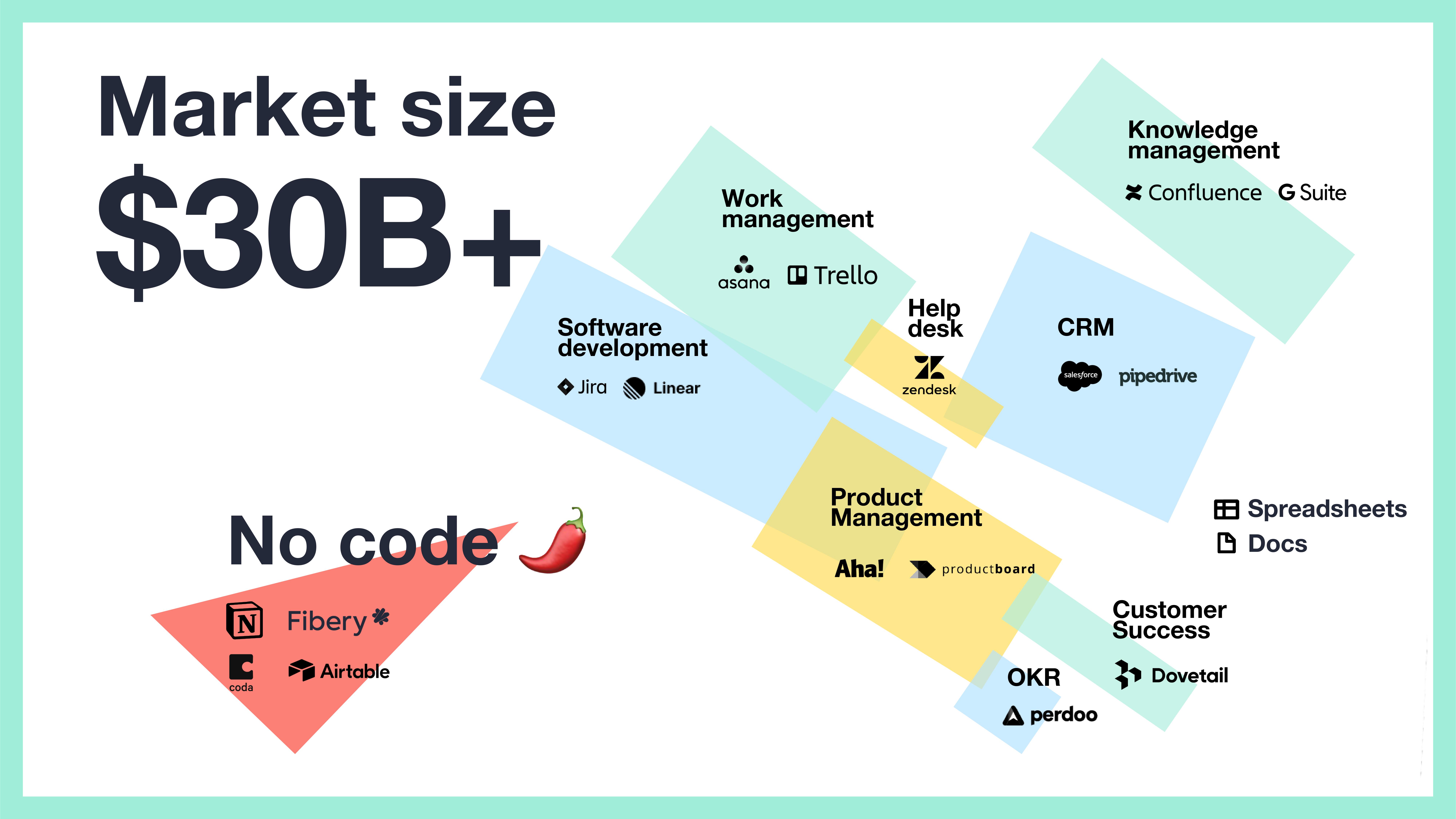 Most startups go with a TAM/SAM/SOM approach to market sizing (although some get it wrong). The market-sizing slide is one of the more important in your deck, and there are lots of different ways of showing and explaining the market size. But this stained-glass chaos isn’t helping anyone. It took me awhile to even find Fibery on this slide (can you be part of your own market size?), and I’m not sure what the company is trying to say here.