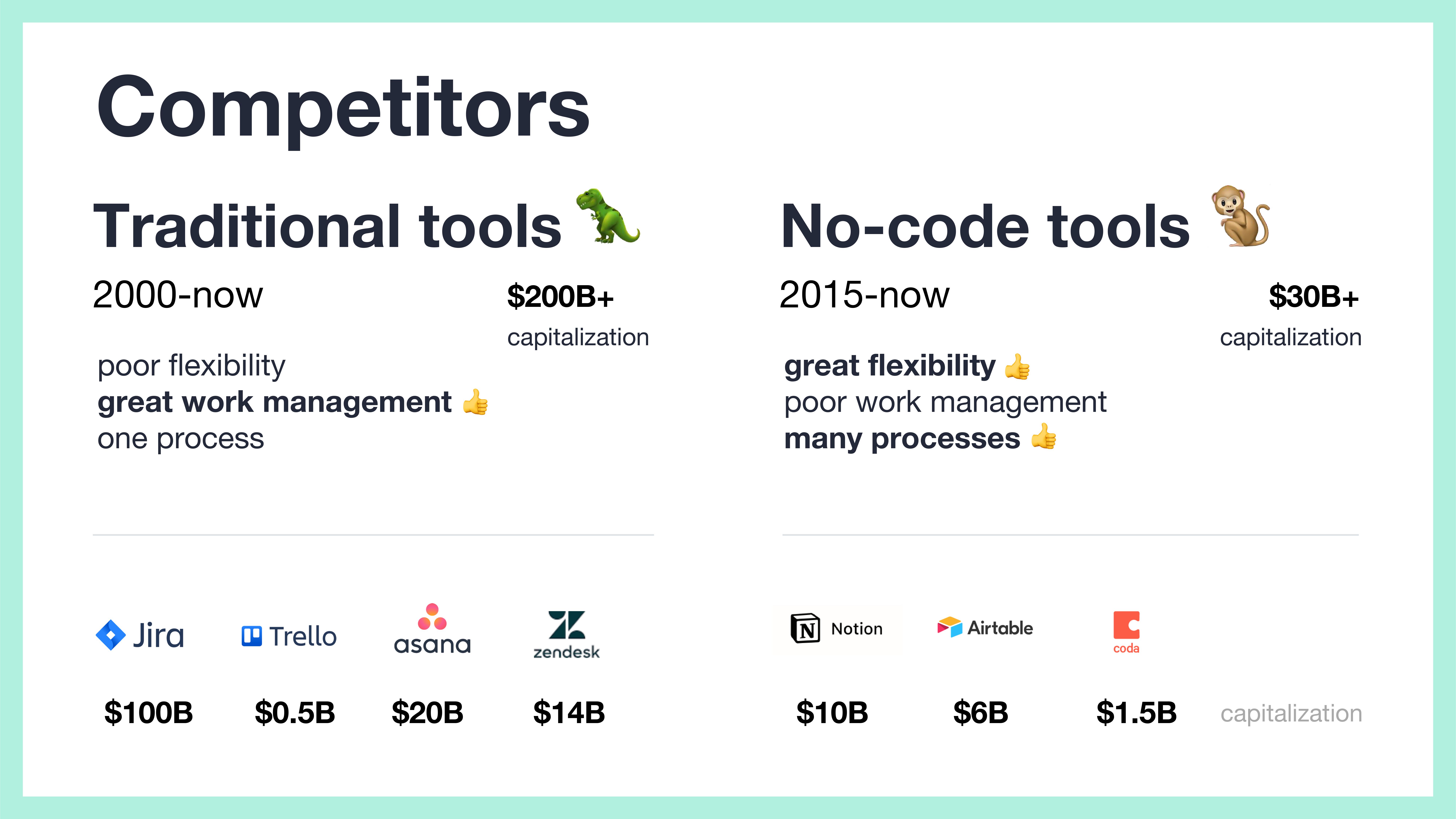 Competition slides are often an afterthought, either because startups underestimate their competitors, or because they claim that they don’t have any. Fibery does a really good job on both fronts.